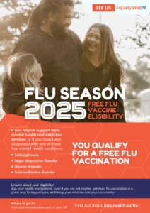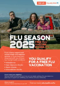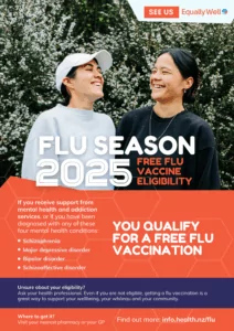 Equally Well aim to motivate families, services, and healthcare professionals to take a proactive approach in aiding individuals with mental health and addiction issues to inquire about the funded flu vaccine. This can be done through services, a general practitioner (GP), pharmacy, or pop-up clinic.